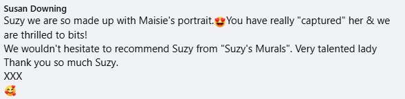 To see reviews from Suzy's Murals customers please keep scrolling down this page. The most recent ones are at the top. As a small business, being recommended by my customers is really important for me. Having good reviews gives potential new customers the confidence to choose me for their projects as well.